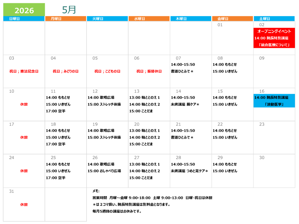 - 院長によるセミナー: 健康の知恵を学ぶ「波動講座」や「催眠心理講座」