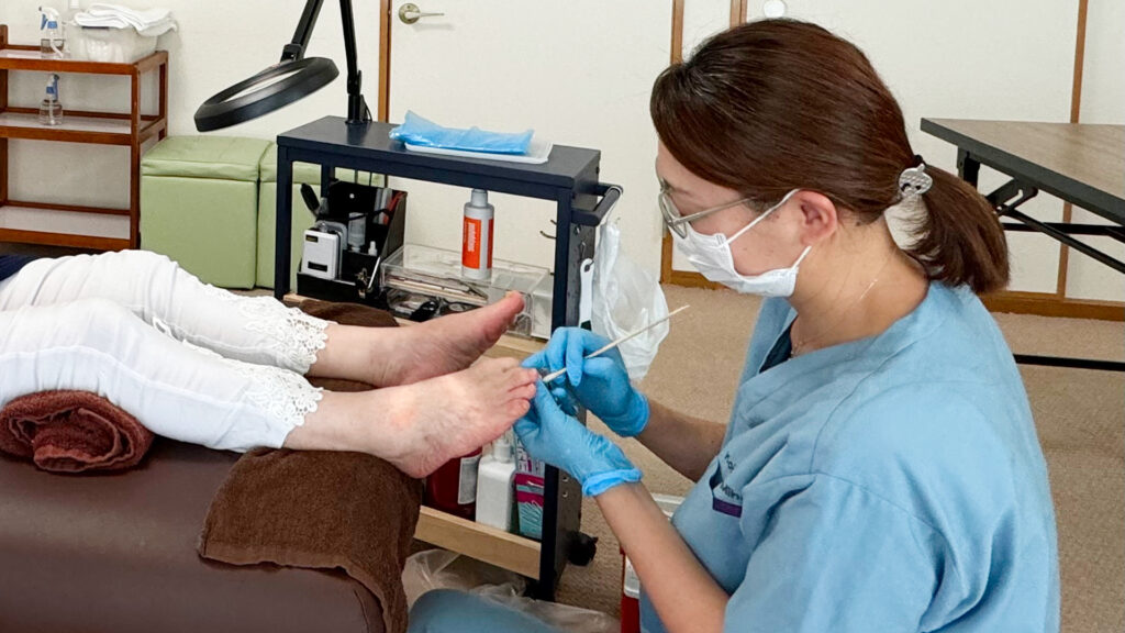 ケアは、まず足湯で足元をあたため、ゆったりとリラックスしていただくことから始まります。 足の状態をやさしく整えながら皮膚や爪をやわらかくし、 爪の生え方や足の状態に十分配慮しながら、安全に丁寧に爪切りを行います。